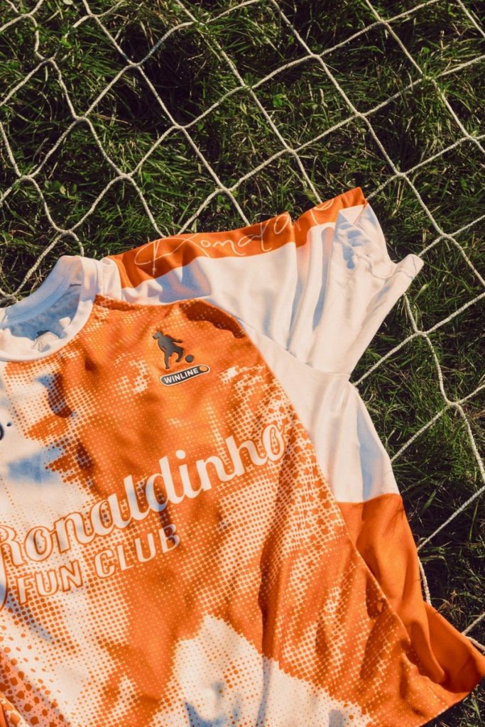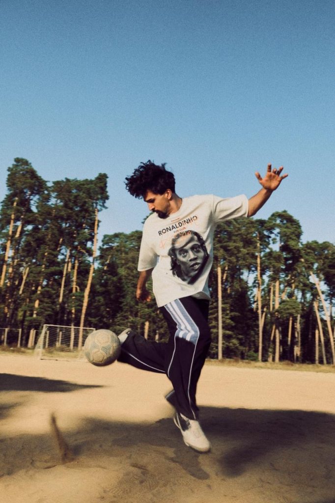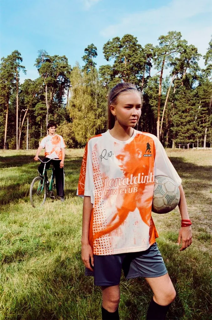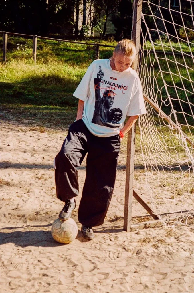 Коллаб с Роналдиньо — это прям теплый (чисто осеннего рыжего цвета) и, кстати, бюджетный флэшбек в юность. В коллекции оверсайз-джерси, футболки со старой типографикой и лонгсливы с автографами и культовыми изображениями Рони (например, тот момент, где он улыбается, забивая «ножницами»).
