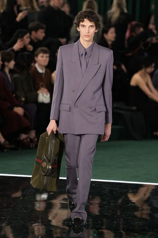 Tailoring — это все, что про касается посадки, структуры и мастерства портных ( как сидит костюм, выглядят плечи и лацканы, соблюден ли баланс форм). И тут Gucci держит линию: на подиуме появилось много костюмов на любой вкус, включая двубортные (две параллельные линии пуговиц) и варианты под водолазку/тонкий трикотаж.
