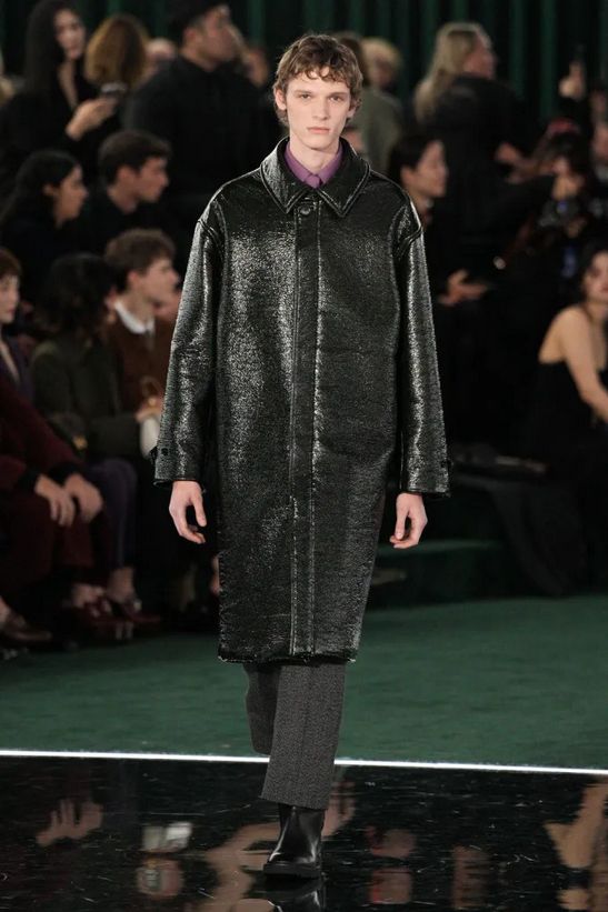 Да, над верхней одеждой они заморачивались в первую очередь: и это логично, учитывая сезон. Помимо классических пальто, были представлены и каркоуты. Нет, это мы не кашляем! Car coat — это такое прямое пальто «до колена, которое удобно накинуть в машину» (его исторически делали под автомобили). Gucci тут показал каркоуты в разных фактурах — включая блестящие/виниловые и твидовые варианты.