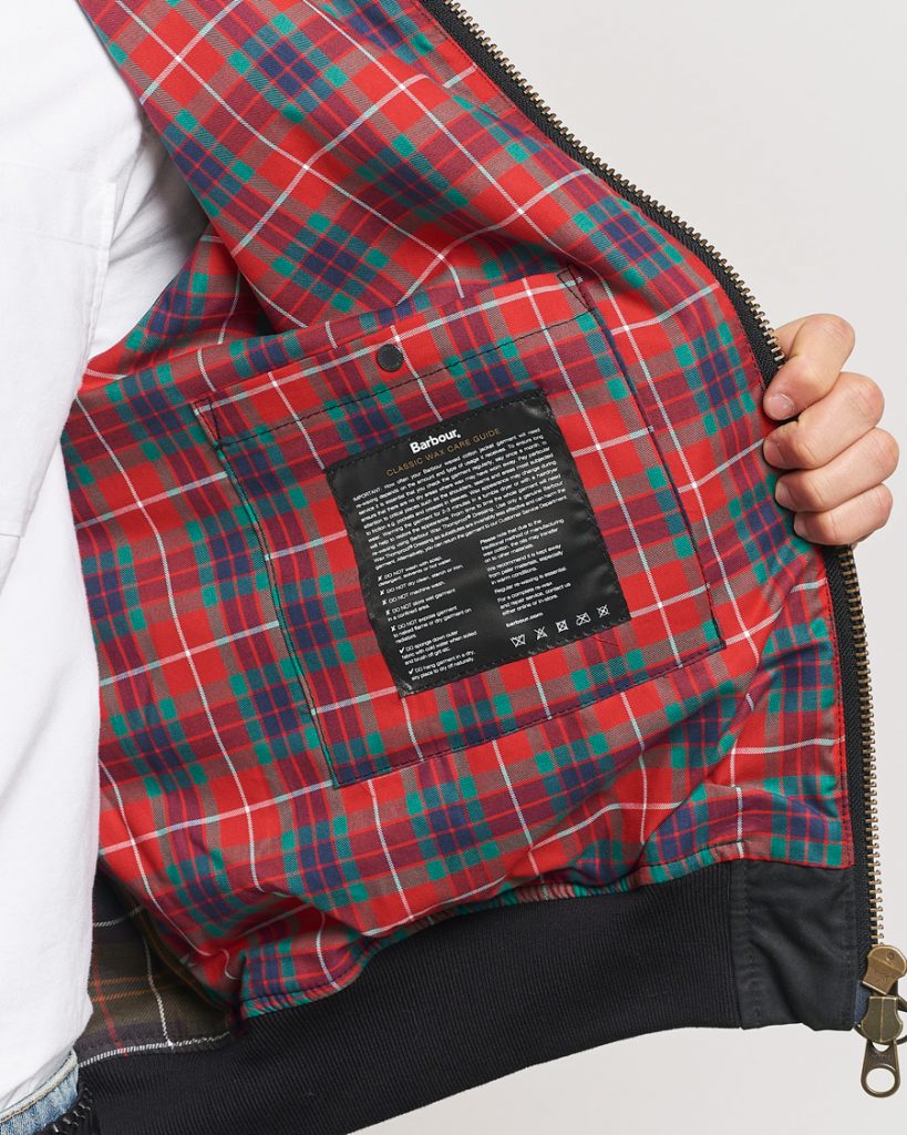 В этой капсуле Harrington (G9) от Baracuta переосмыслен: вместо обычного легкого хлопка —  waxed cotton от Barbour (8 oz), что дает надежную защиту от дождя и ветра. При этом сохранена классическая форма Harrington, как Baracuta ее и задумывали: raglan-рукава, «зонт-спинка», и силуэт все тот же. Шерстяную клетку, кстати, тоже оцениваем!