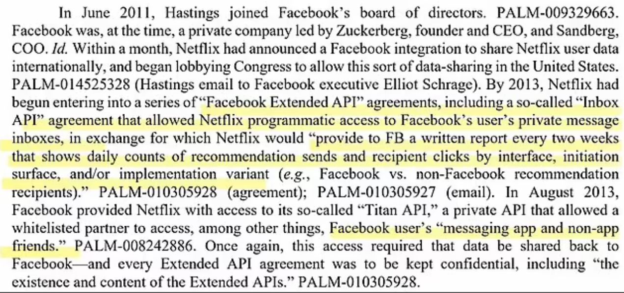 На фоне этого лора истцы утверждают, что Facebook предоставлял Netflix «bespoke access» — индивидуальный, не публичный доступ к пользовательским данным. Это оформилось соглашение Inbox API, которое