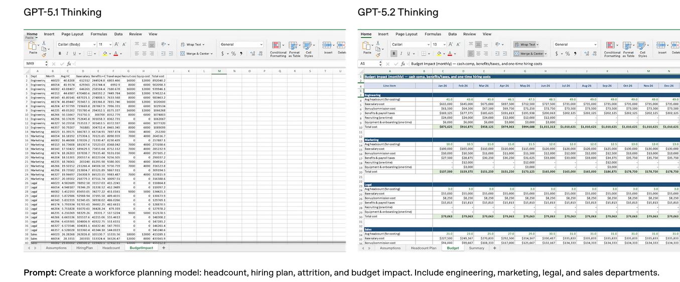 Но разными уровнями размышления над ответом сейчас уже никого не удивишь. Что действительно любопытно, так это то, что GPT-5.2 может решать реальные, сложные задачи, выходящие далеко за рамки обычного текстового общения. Так, например, продвинулась новая модель относительно предыдущей в расчетах бюджета огромной компании: