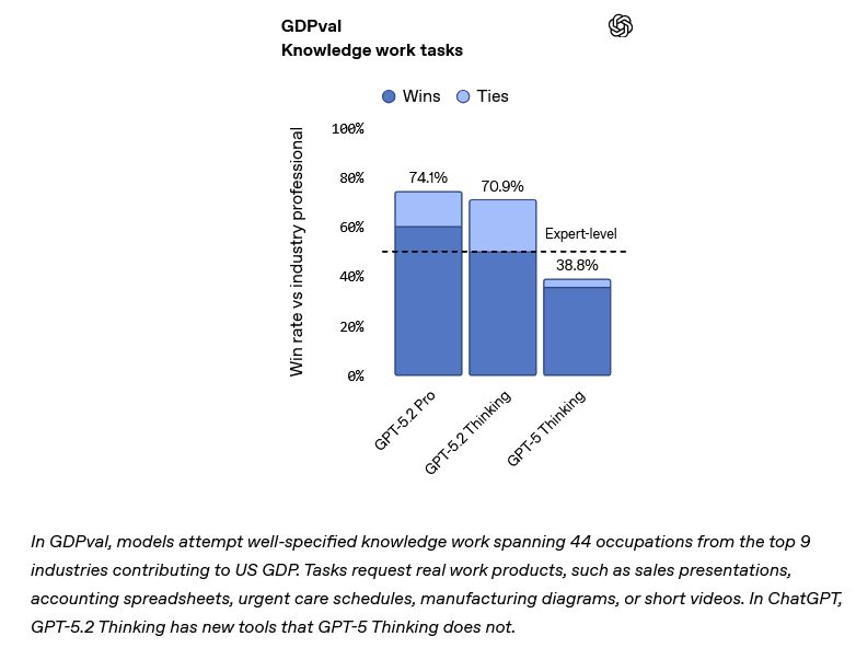 GDPval (оценка профессионального знания и реальной работы) показывает, что продвинутые версии справляются лучше квалифицированных людей на ряде задач: при оценке 44 профессий модель выигрывает/добывает ничью с экспертами в 70%+ случаев. То есть для работы она не то, что правая рука, она чуть ли не целый мозг.