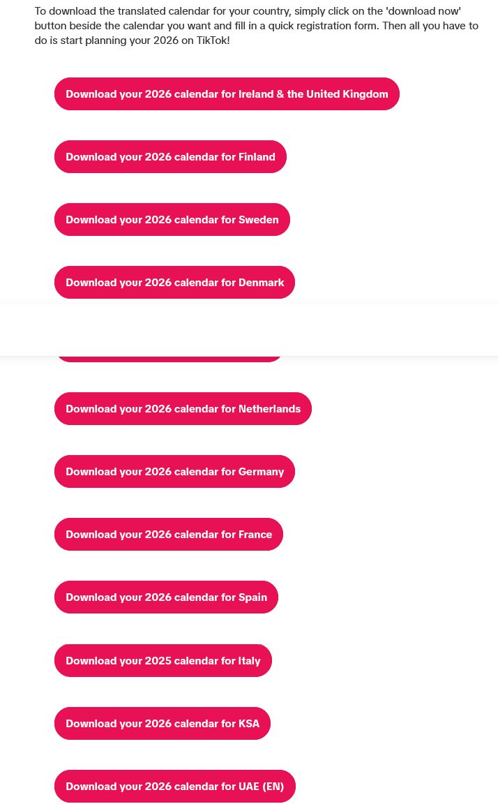 Your 2026 SMB marketing calendars are here! — объявил нам TikTok и дропнул расписание праздников и событий почти по каждому ключевому гео.